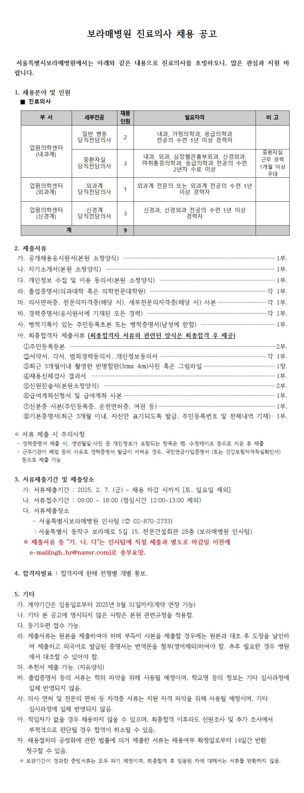 보라매병원 진료의사(당직전담의사) 채용 공고