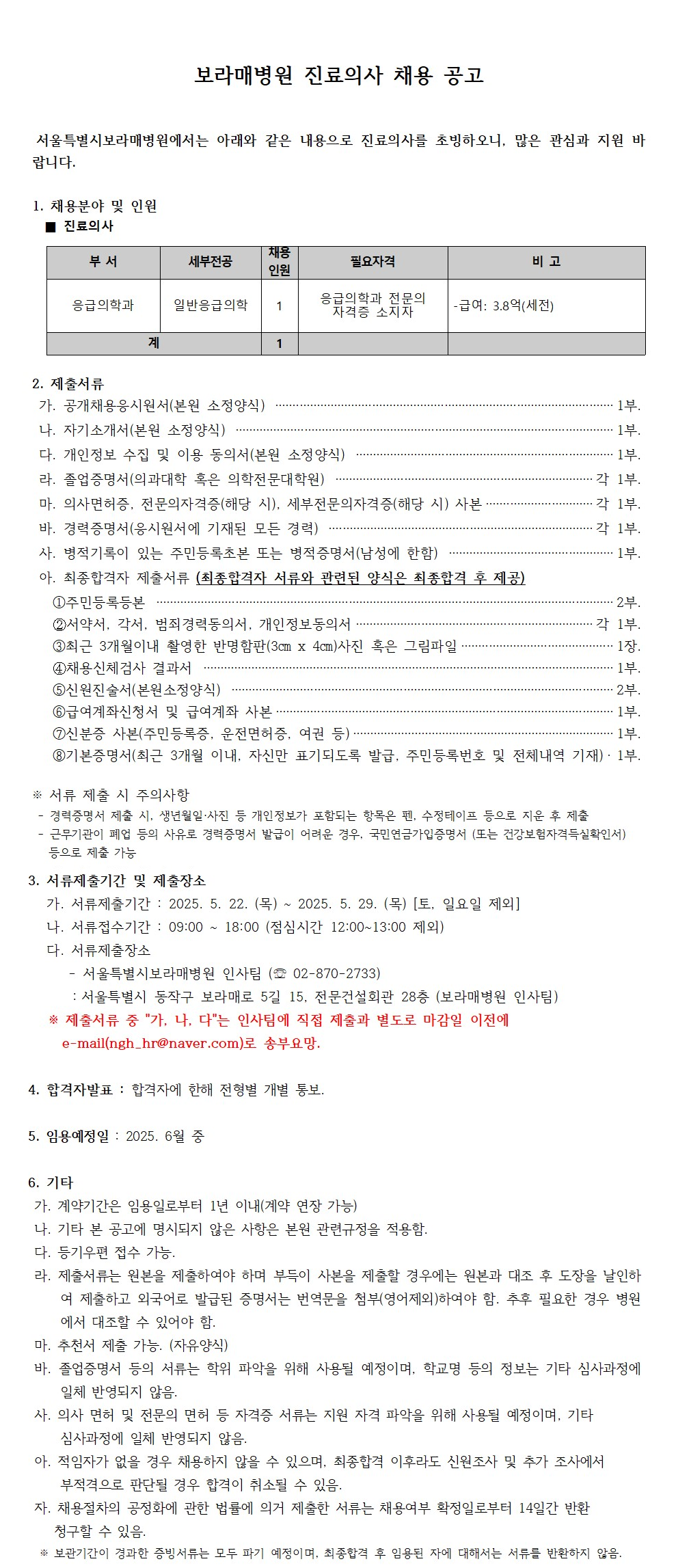 보라매병원 2025년 5월 대체근로자 등 채용 공고 (장애인 특별우대)...