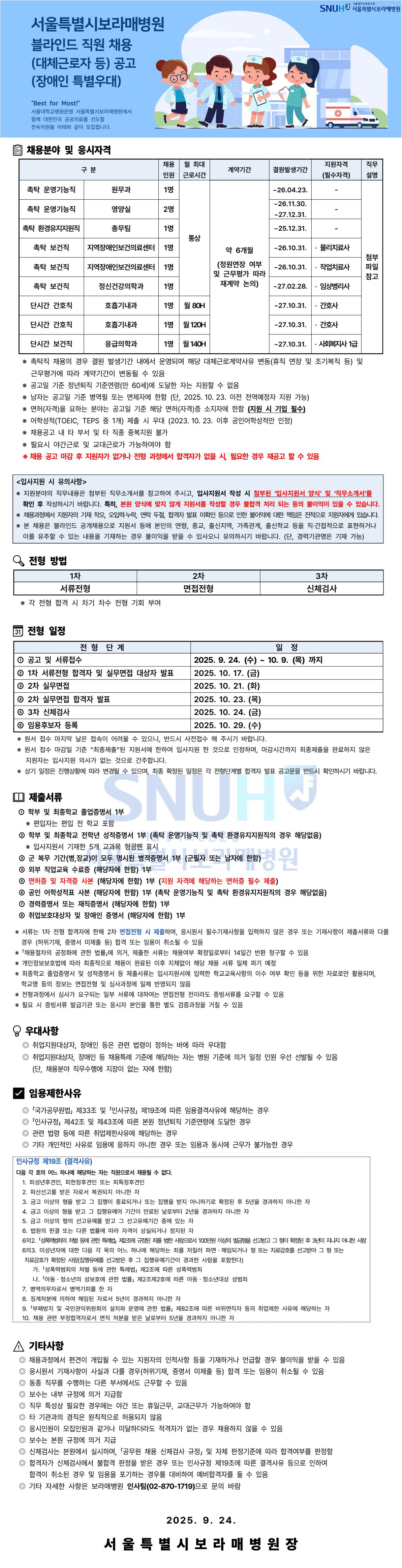 보라매병원 2025년 10월 블라인드 직원 채용 (대체근로자 등) 공고 (장애인 특별우대)