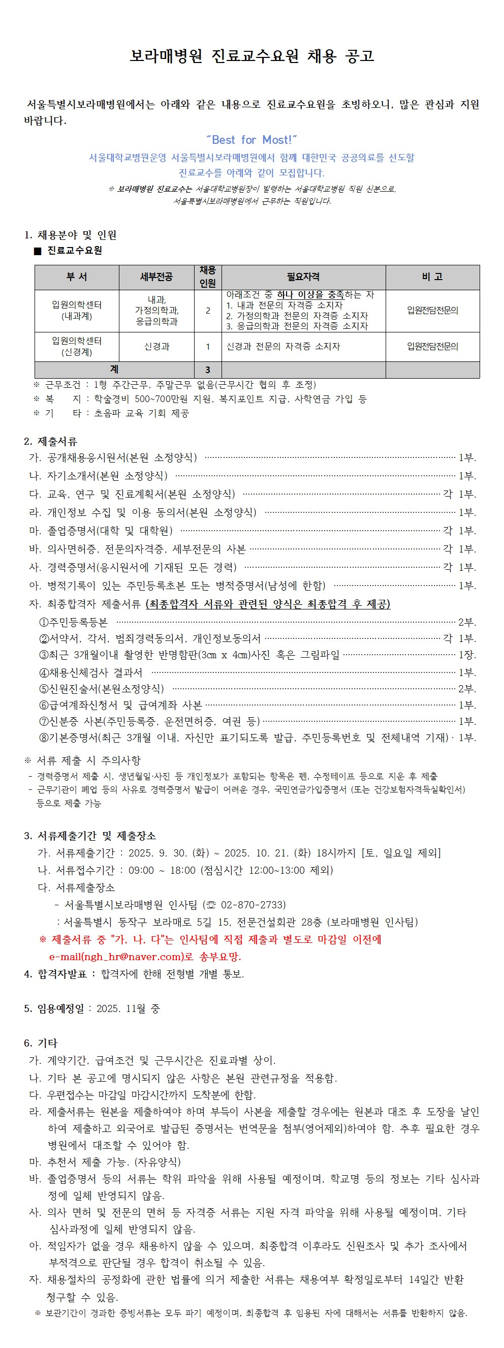 보라매병원 진료교수요원(입원전담전문의) 채용 공고