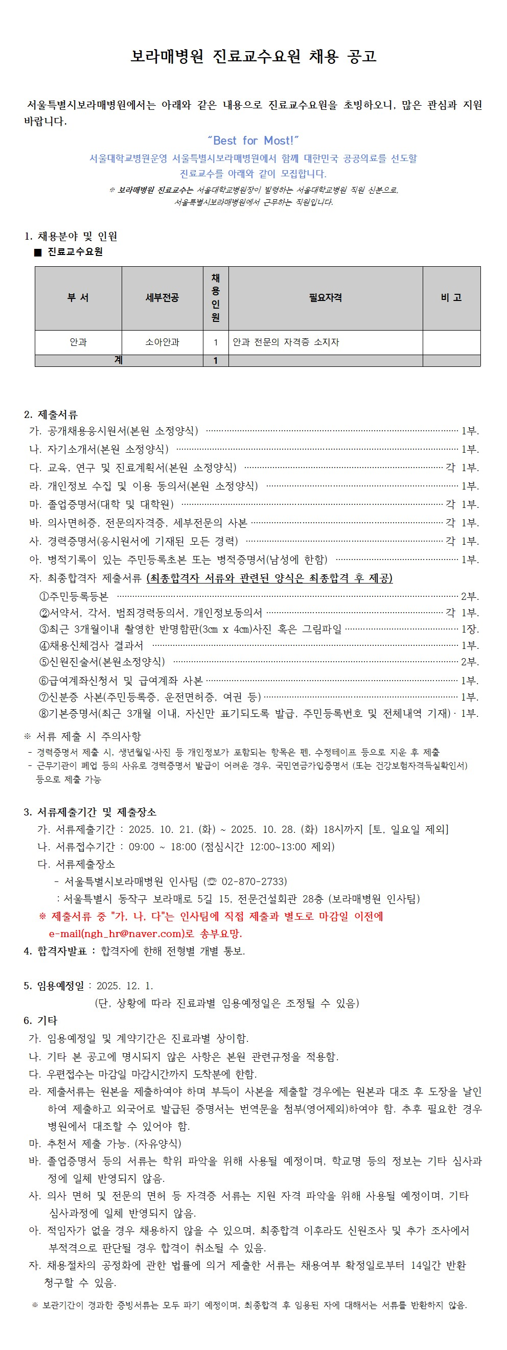 보라매병원 진료교수요원(안과) 채용 공고