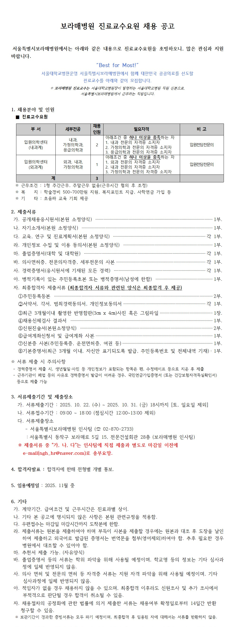 보라매병원 진료교수요원(입원전담전문의) 채용 공고