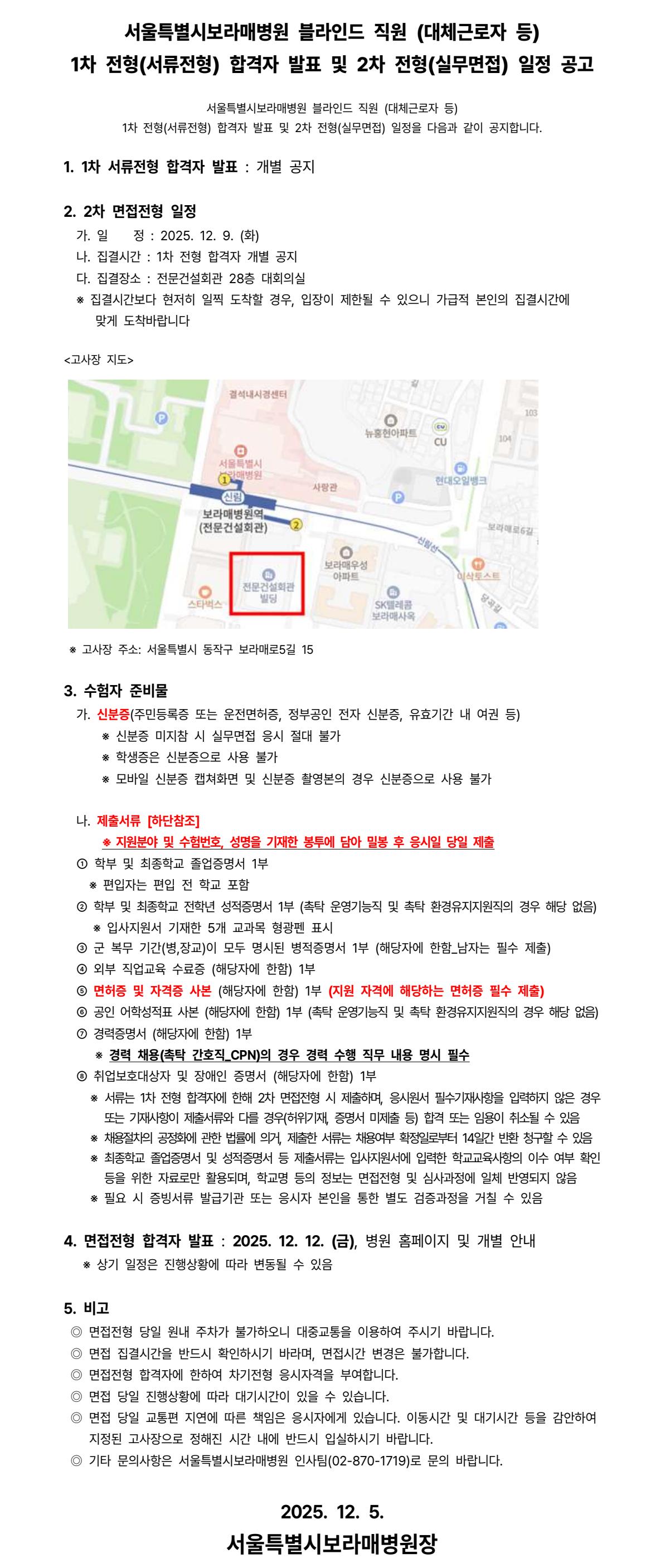 보라매병원 2025년 12월 대체근로자 등 채용 공고 (장애인 특별우대) 서류전형 합격자 발표