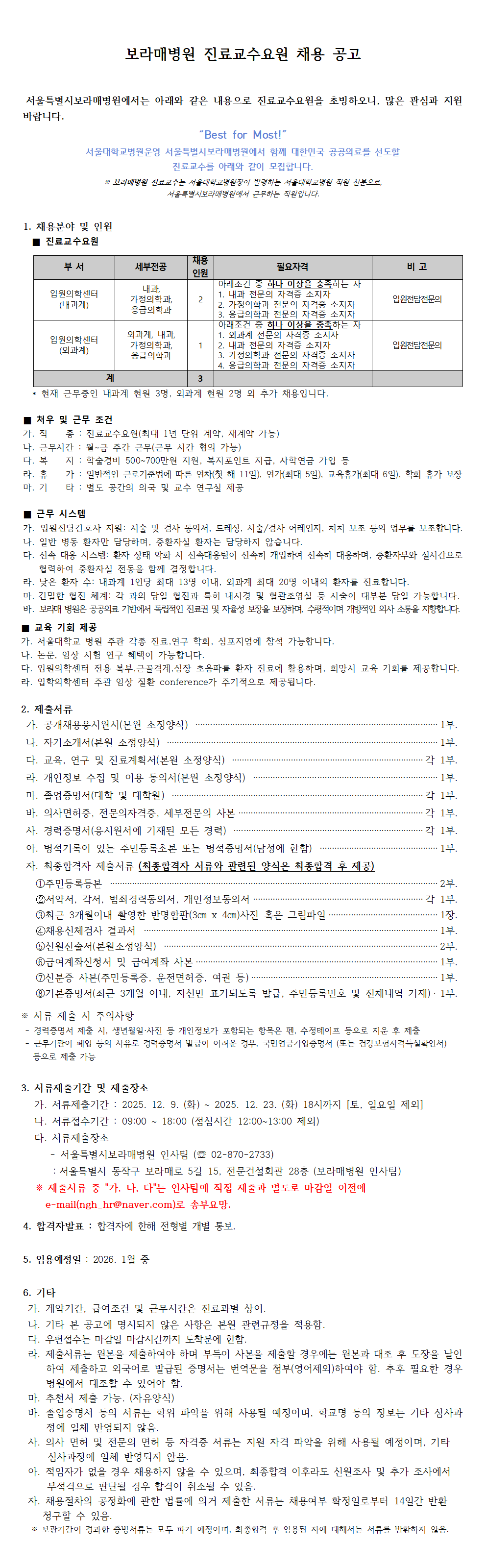 보라매병원 진료교수요원(입원전담전문의) 채용 공고