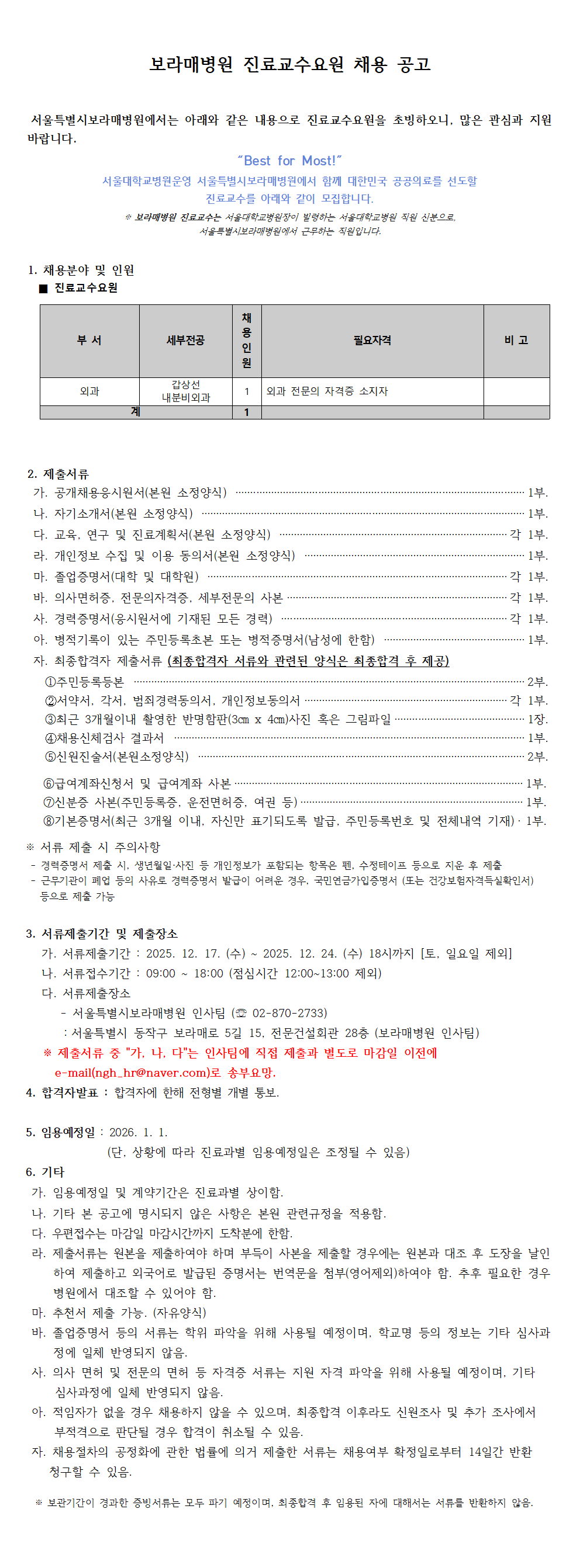 보라매병원 진료교수요원(외과) 채용 공고