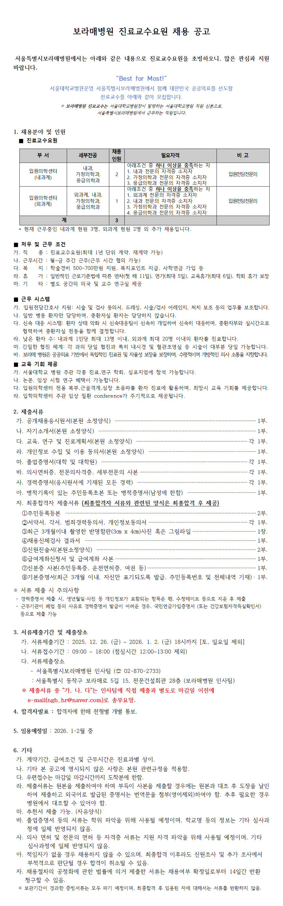 보라매병원 진료교수요원(입원전담전문의) 채용 공고