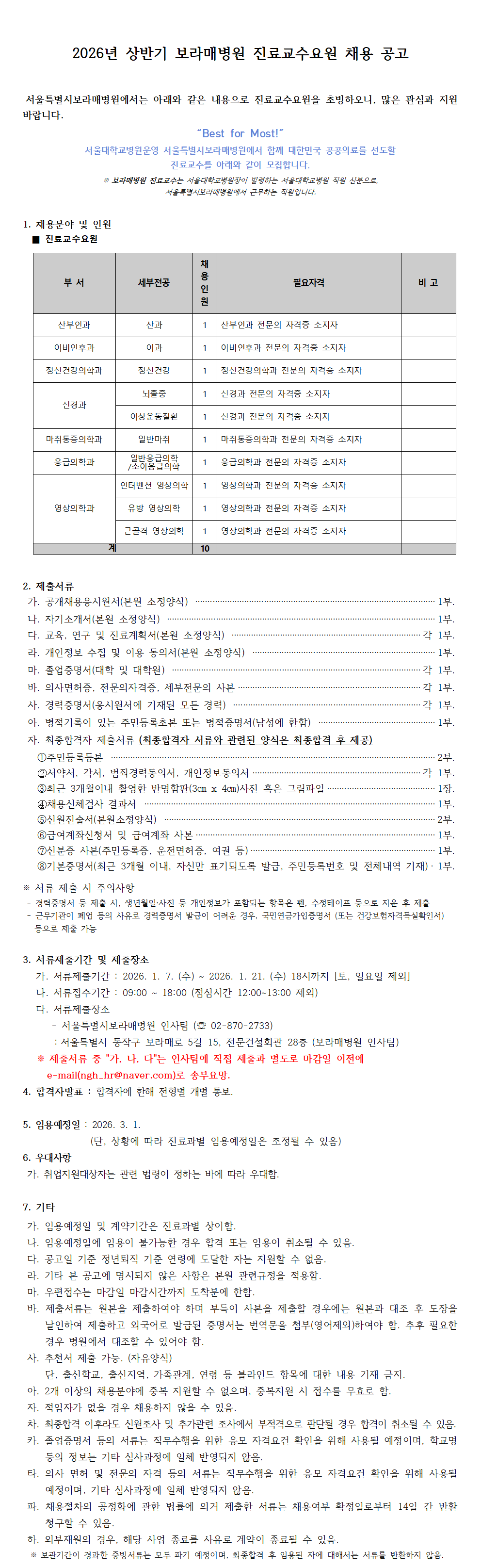2026년 상반기 보라매병원 진료교수요원 채용공고