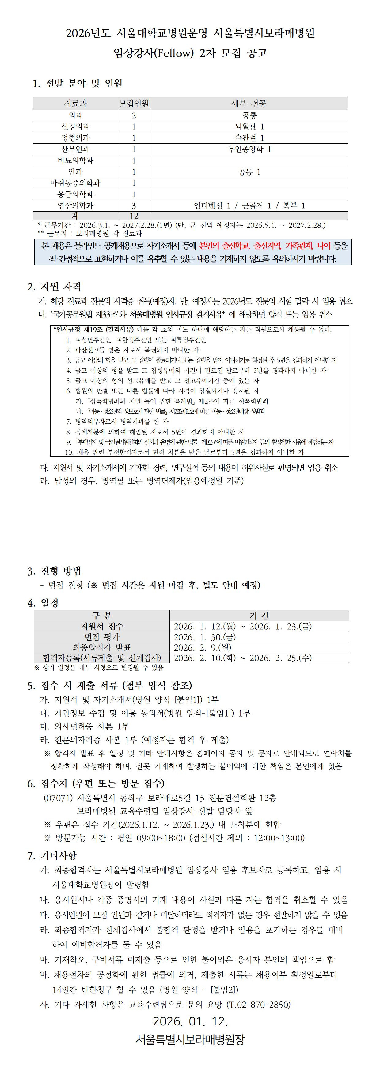 2026년도 서울특별시보라매병원 임상강사(Fellow) 2차 모집 공고