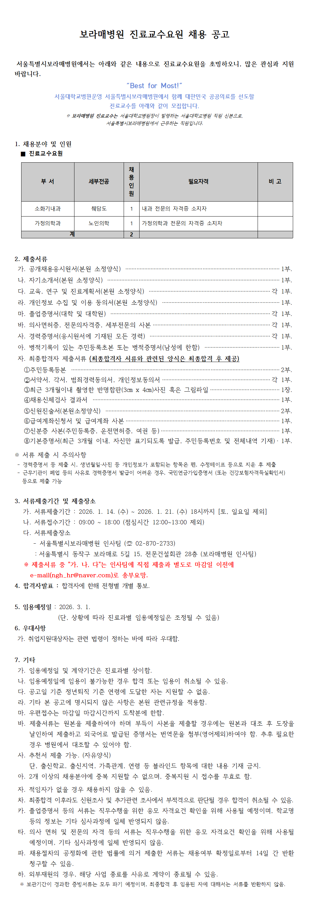 보라매병원 진료교수요원(소화기내과, 가정의학과) 채용 공고
