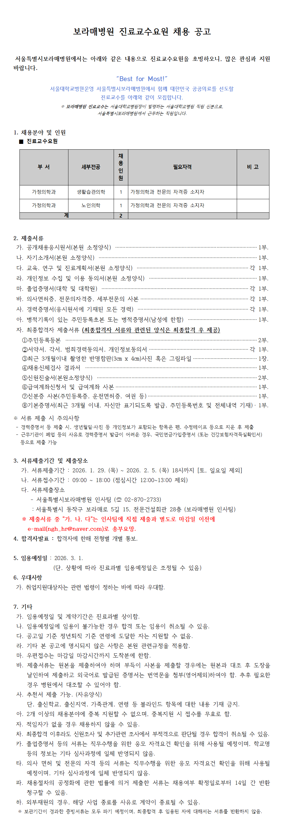 보라매병원 진료교수요원(가정의학과) 채용 공고