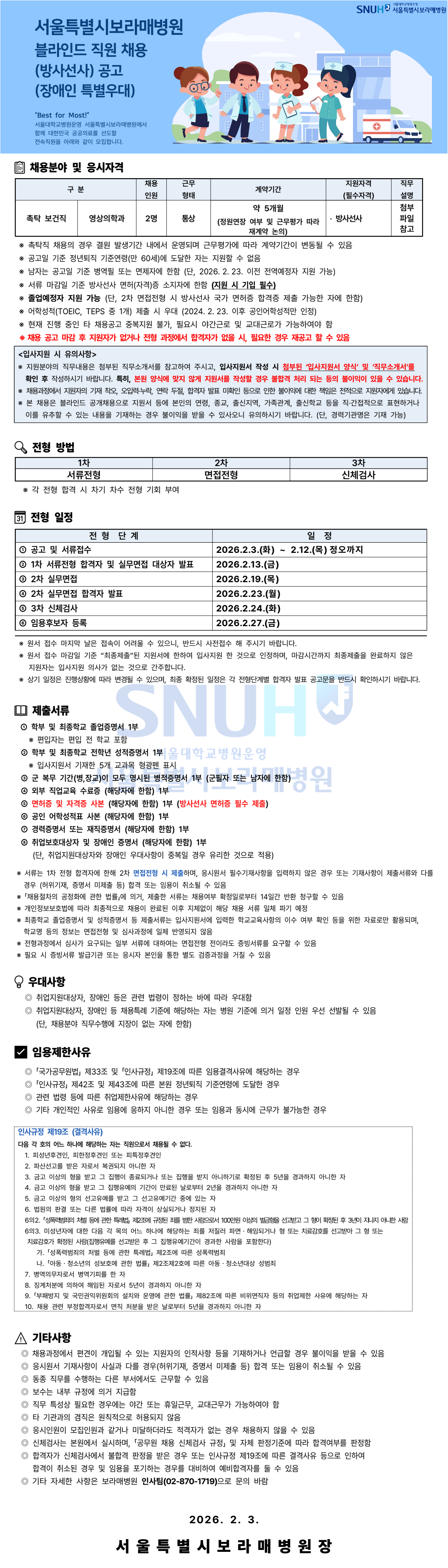 보라매병원 2026년 2월 블라인드 직원 추가 채용 (방사선사) 공고 (장애인 특별우대)