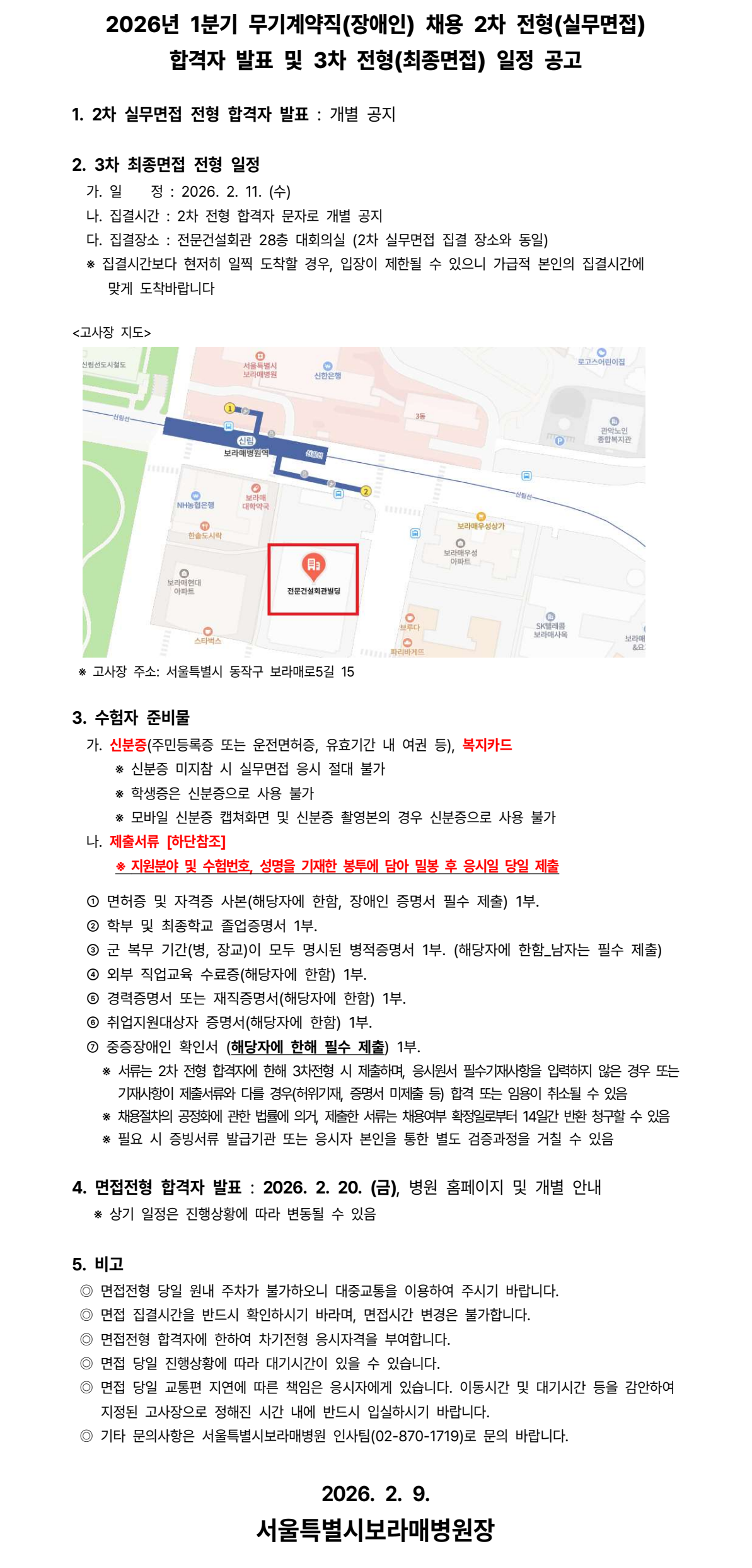 2026년 1분기 무기계약직(장애인) 채용공고 2차 전형(실무면접) 합격자 발표 및 3차 전형(최종면접) 일정 공고