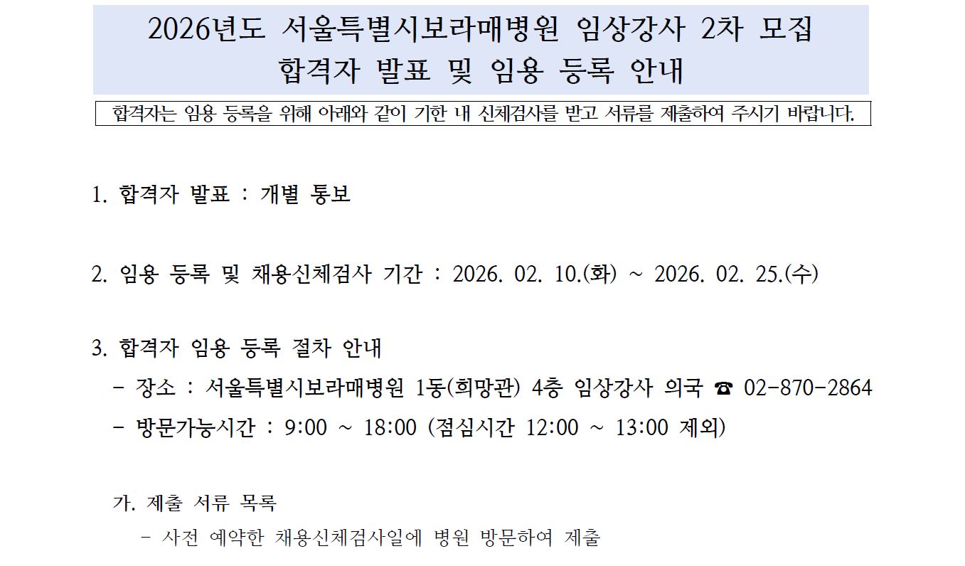 2026년도 서울특별시보라매병원 임상강사(Fellow) 2차 모집 합격자 발표 및 임용 등록 안내