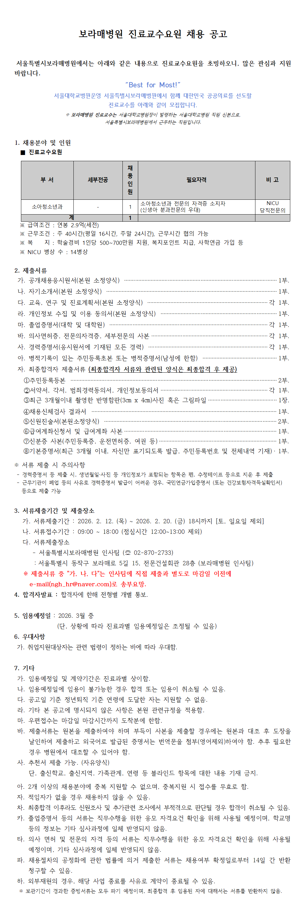 보라매병원 진료교수요원(소아청소년과) 채용 공고