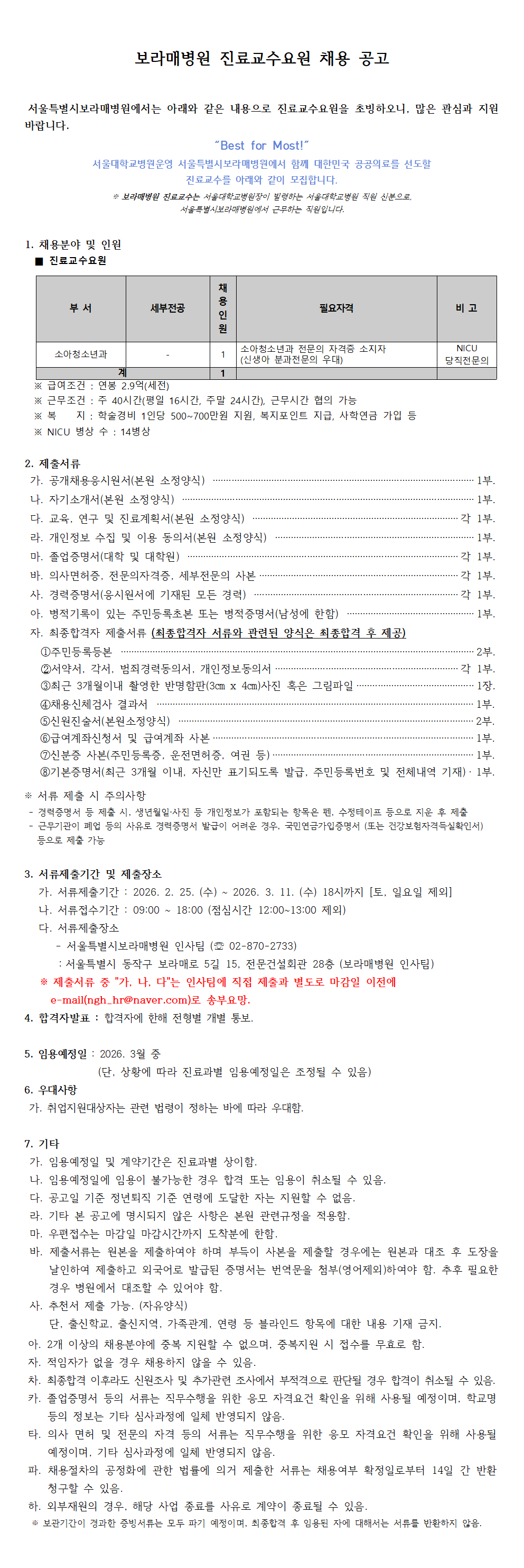 보라매병원 진료교수요원(소아청소년과) 채용 공고