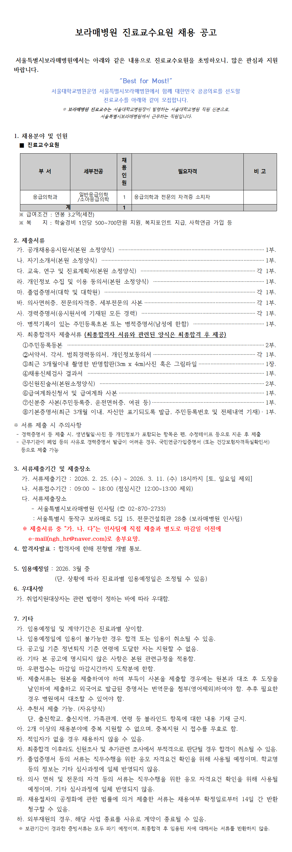보라매병원 진료교수요원(응급의학과) 채용 공고