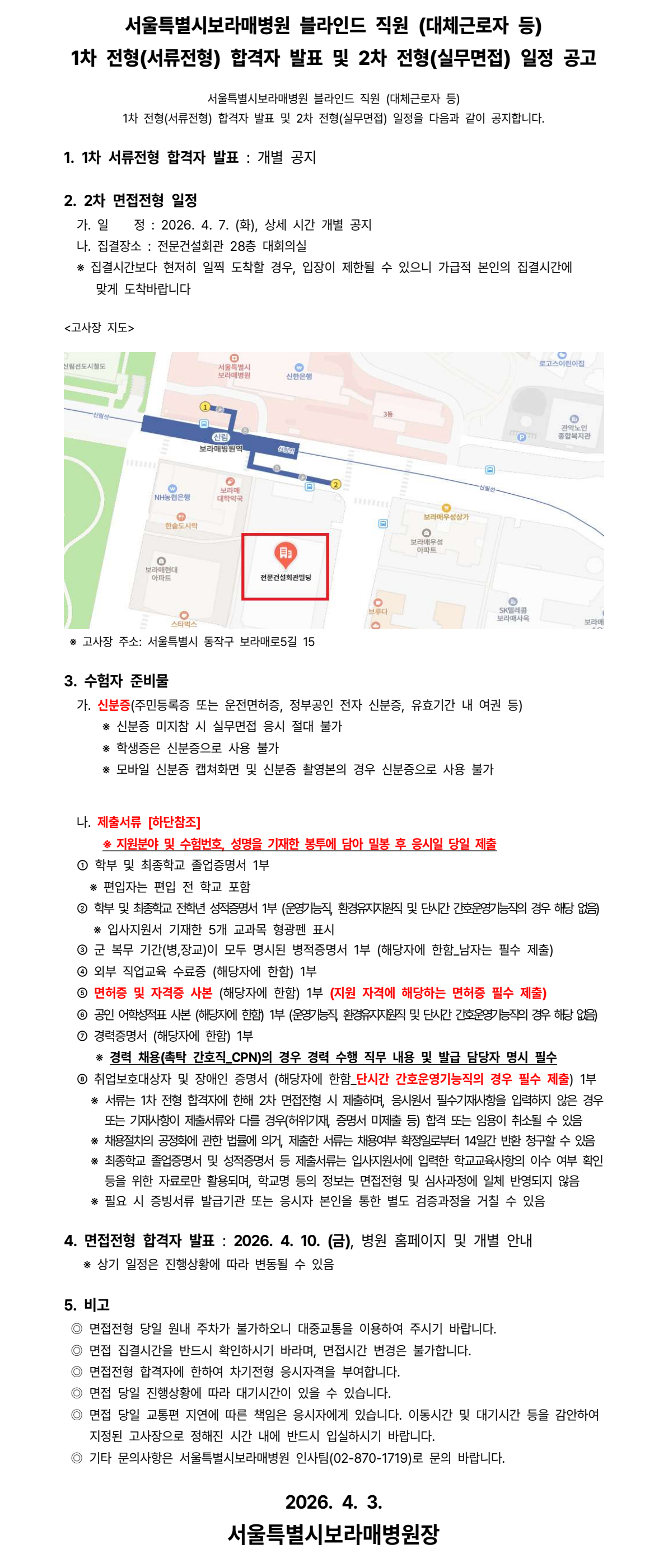 보라매병원 2026년 4월 대체근로자 등 채용 공고 (장애인 특별우대) 서류전형 합격자 발표